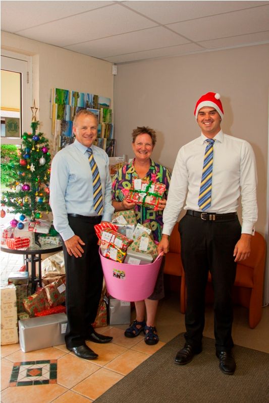 Terry Digger and Lachlan Campbell from Ray White Gerringong handing over the collected gifts to Robyn Dalley from Rotary Club of Gerringong Sunrise.
